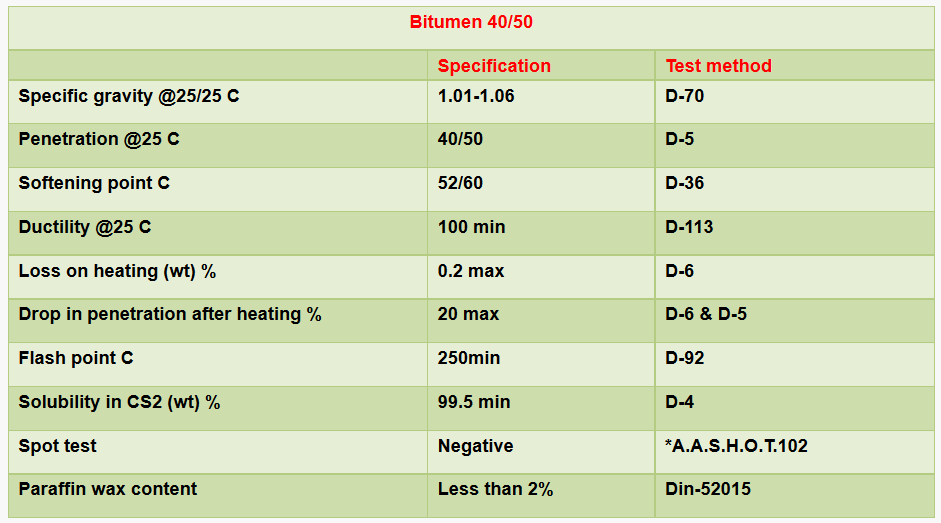 در ادامه، به برخی از ویژگی های قیر با درجه نفوذ ۵۰-۴۰ اشاره می کنیم: