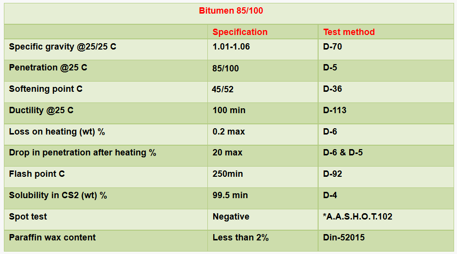 در ادامه، به برخی از ویژگی های قیر با درجه نفوذ ۱۰۰-۸۵ اشاره می کنیم: